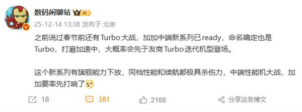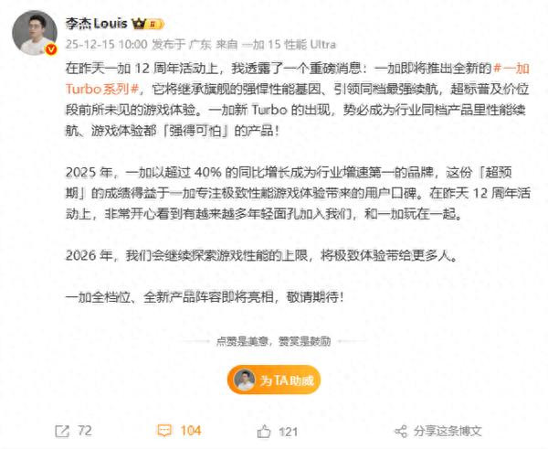 【TechWeb】前段时间,一加陆续推出了一加15、一加Ace6、一加Ace 6T等多款机型,在各自档位都属于口碑一流的存在,受到了用户的广泛好评。而除了现有的几个系列以外,此前有爆料称一加将推出全新的一加Turbo系列。现在有最新消息,近日一加中国区总裁李杰正式官宣该系列,主打超强性能和续航体验。